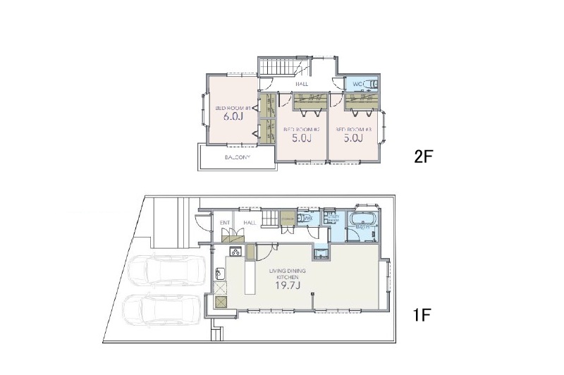 1階 LD13.5畳 / 1階 K5.4畳 / 1階 和室8.0畳 / 2階 洋室8.4畳 / 2階 洋室6.0畳 3部屋 |
