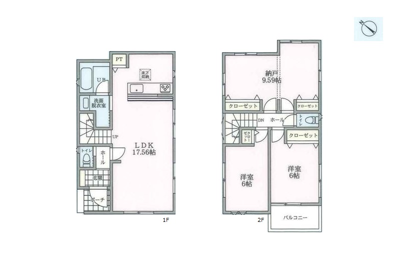| 間取内容 | 1階 LDK17.5畳 / 2階 洋室6.0畳 2部屋 / 2階 S9.5畳 | ||