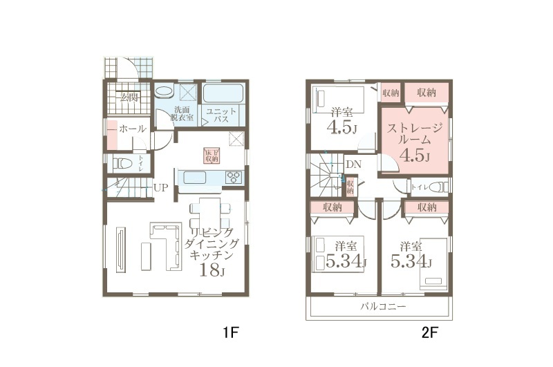 1階 LDK18畳 / 2階 洋室5.3畳 2部屋 / 2階 洋室4.5畳 / 2階 S4.5畳 |