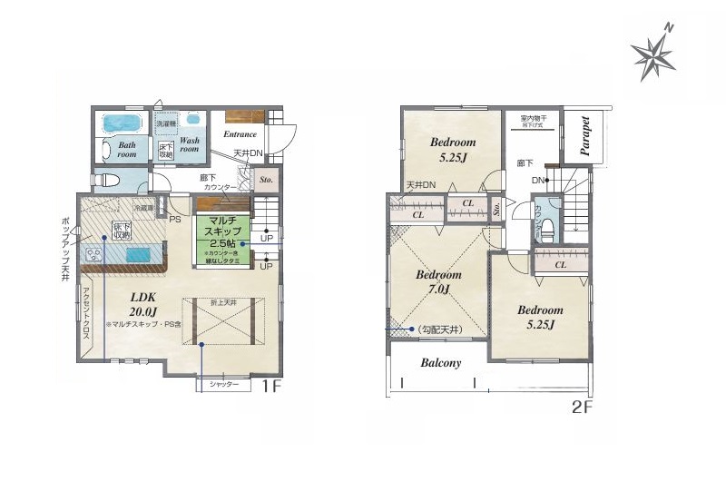 1階 LDK20.0畳 / 2階 洋室7.0畳 / 2階 洋室5.2畳 2部屋 |