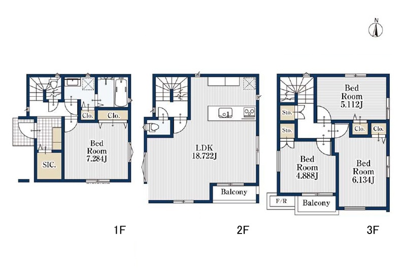 1階 洋室7.2畳 / 2階 LDK18.7畳 / 3階 洋室6.1畳 / 3階 洋室5.1畳 / 3階 洋室4.8畳 |