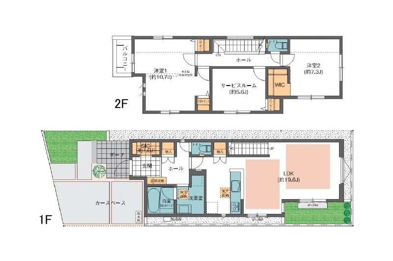 1階 LDK19.6畳 / 2階 洋室10.7畳 / 2階 洋室7.3畳 / 2階 S5.6畳 |
