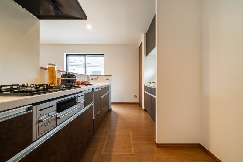 キッチン横のパントリーや各居室の収納、大容量のウォークインクローゼットなど収納スペースが豊富。道路面から一段上がった立地のため、通行人の視線が気になりにくく、プライバシー性の高い住環境を実現!デザイナーと手掛けたシンプルかつ高級感溢れるエクステリア。充実した設備・仕様で快適な暮らしが期待できます!カースペースあります。