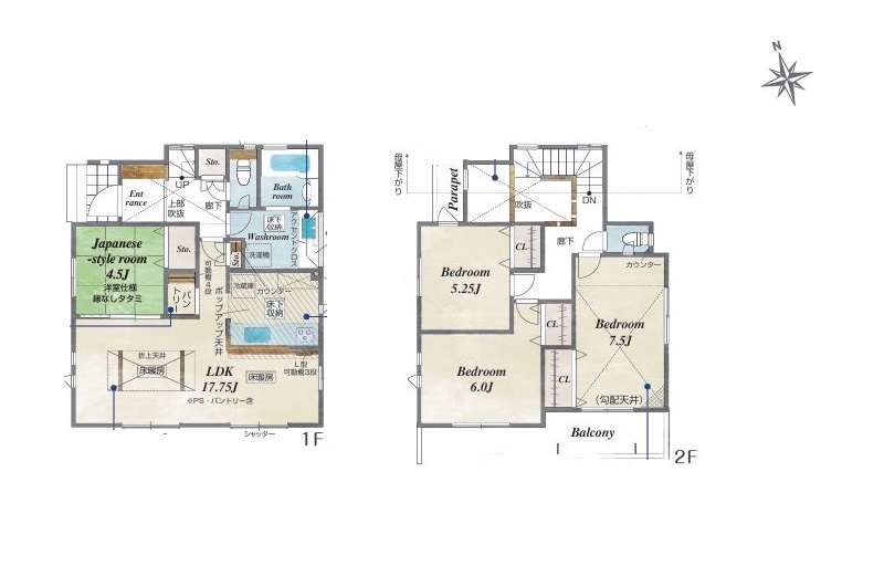1階 LDK17.7畳 / 1階 和室4.5畳 / 2階 洋室7.5畳 / 2階 洋室6.0畳 / 2階 洋室5.2畳 |