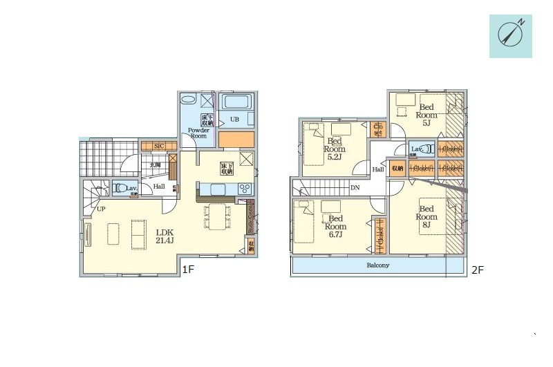1階 LDK21.4畳 / 2階 洋室6.7畳 / 2階 洋室8.0畳 / 2階 洋室5.2畳 / 2階 洋室5.0畳 |