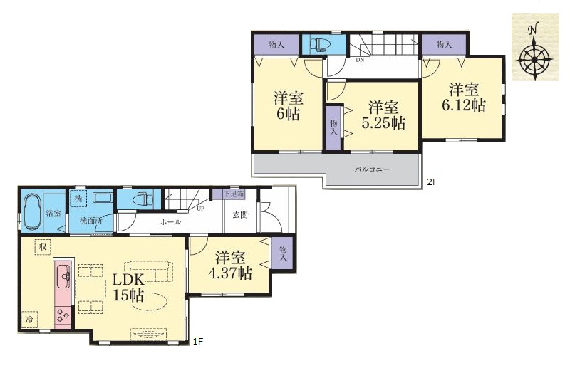 1階 LDK15.0畳 / 1階 洋室4.5畳 / 2階 洋室6.1畳 / 2階 洋室6.0畳 / 2階 洋室5.2畳 |