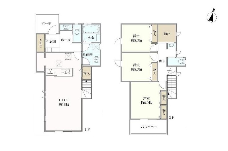 - 1階 LDK18.0畳 / 2階 洋室6.9畳 / 2階 洋室5.3畳