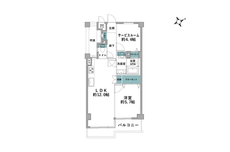- LDK12畳 / 洋室5.7畳 / S4.4畳