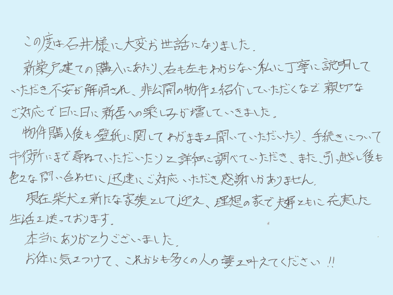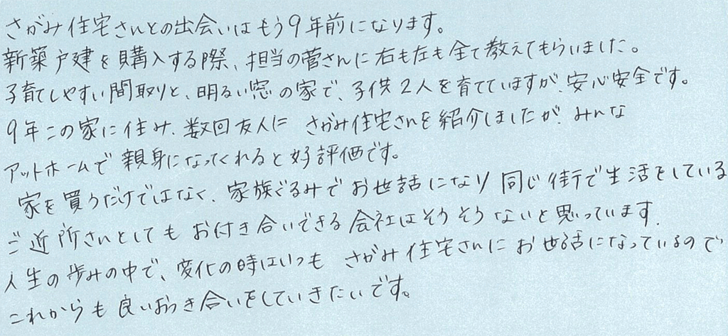 親身に相談に乗って下さり、住宅購入まで大きな不安なく迎えられたこと、大変感謝しております。2019年9月 | M様